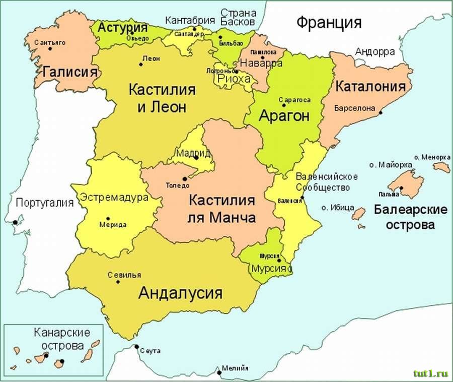 В административном отношении Испания подразделяется на 17 автономных областей, которые, в свою очередь, делятся на 50 небольших провинций.