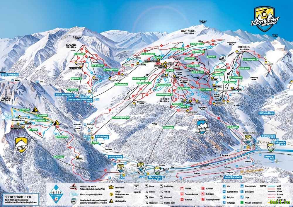 Майрхофен удобен тем, что в 10-ти минутах езды на маршрутном автобусе находится вершина Ахорн. В этой зоне катания немало "голубых" маршрутов (трасс пониженной сложности для новичков), поэтому она рекомендована для начинающих и неопытных спортсменов.