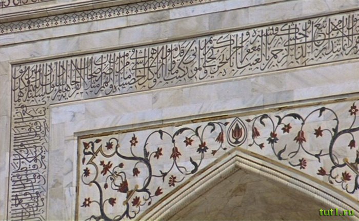 Над входом красуются слова из Корана. Выложены они из черного сланца. К верху, буквы становятся больше, поэтому людям, находящимся внизу, они кажутся одинакового размера.