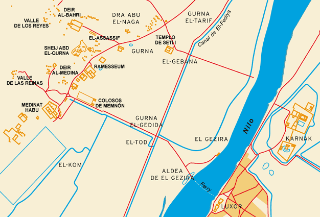 Местные жители условно подразделяют Луксор на «Город живых» и «Город мертвых». Под «живым городом» подразумевается жилой район, занявший правый берег Нила. Для туристов он примечателен Карнакским и Луксорским храмами, соединенными в единый ансамбль через аллею сфинксов. «Город мертвых» занимает часть противоположного берега великой реки. Его поселения немногочисленны, ведь на самом деле он является древним кладбищем. Здесь находится фиванский некрополь и множество погребальных храмов, в которых покоятся цари, царицы и божества.