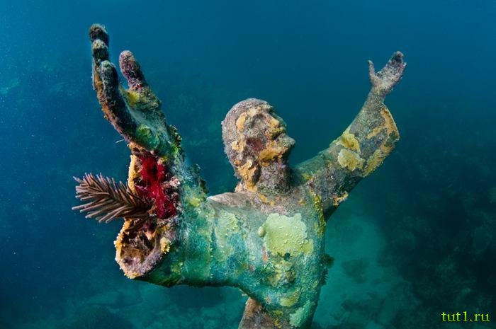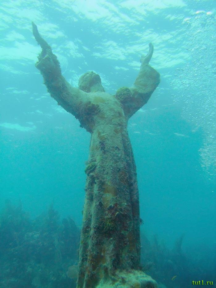 В 1954-м году на дне бухты возле аббатства на глубине 17 метров установили статую "Христос из бездны" (в аббатстве находится её точная копия), вокруг которой располагаются плиты, на которых высечены имена тех, кто погиб в море. Идея создания подводной скульптуры спасителя впервые пришла в голову итальянскому дайверу Дулио Марканте во время подводной медитации. Он находился под водой и вдруг его озарило — "Так ведь здесь же, на этом месте, где я сейчас нахожусь в 1947-м году погиб первый итальянский аквалангист Дарио Ганзатти. Надо его увековечить!". Кстати, в разных частях света находятся несколько аналогичных статуй, так же носящих имя "Христос из бездны", ну и конечно, они привлекают сотни дайверов.