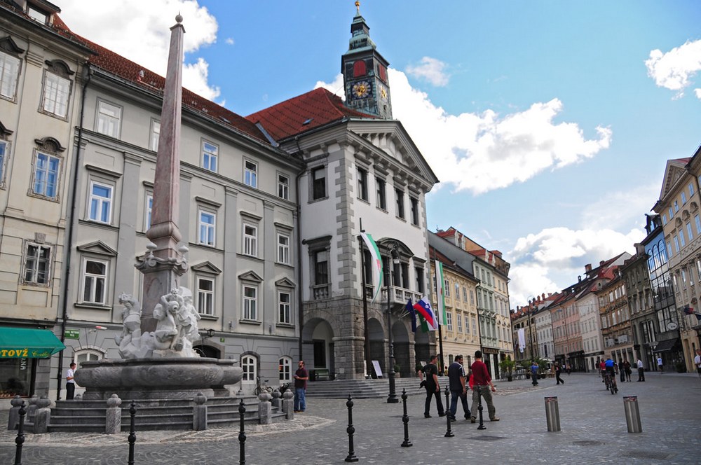 - Ратуша Любляны – старинное здание, в котором ныне располагаются городские власти. Самому зданию уже больше 500 лет, его несколько раз перестраивали, и его первоначальный вид не сохранился. Сегодня – это красивое здание в барочном стиле. Над порталом одного из входов привлекает к себе внимание фреска – карта Любляны 17 века. Здание это интересно и само по себе, но напротив него находится удивительный фонтан "Реки Карниолии". Изображенные три фигуры символизируют три реки, которые протекают в Словении – это Крку, Савву и Любляница.