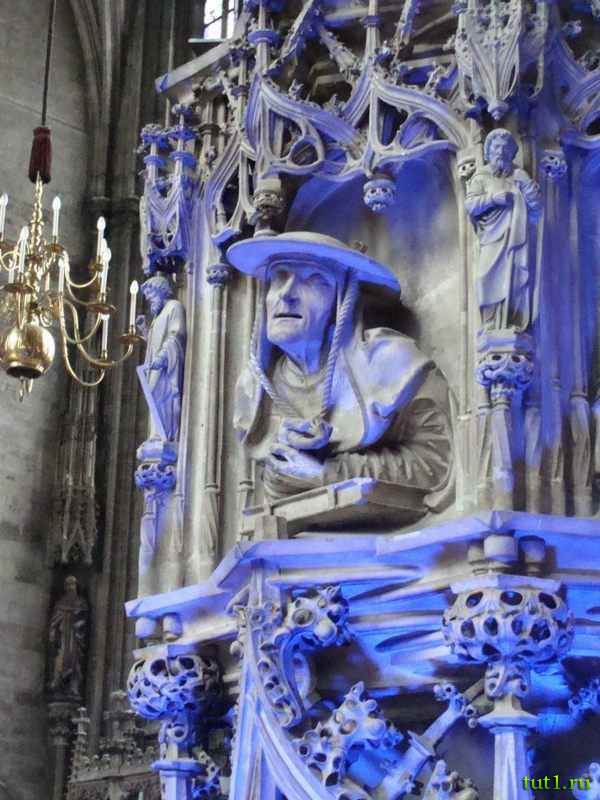 Надгробный памятник Фридриху III из красного мрамора высекали на протяжении 30-ти лет и закончили лишь потому, что он срочно понадобился заказчику. Из известных исторических личностей здесь похоронены Фридрих III, Рудольф IV и Евгений Савойский.