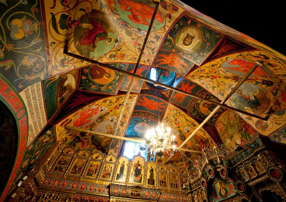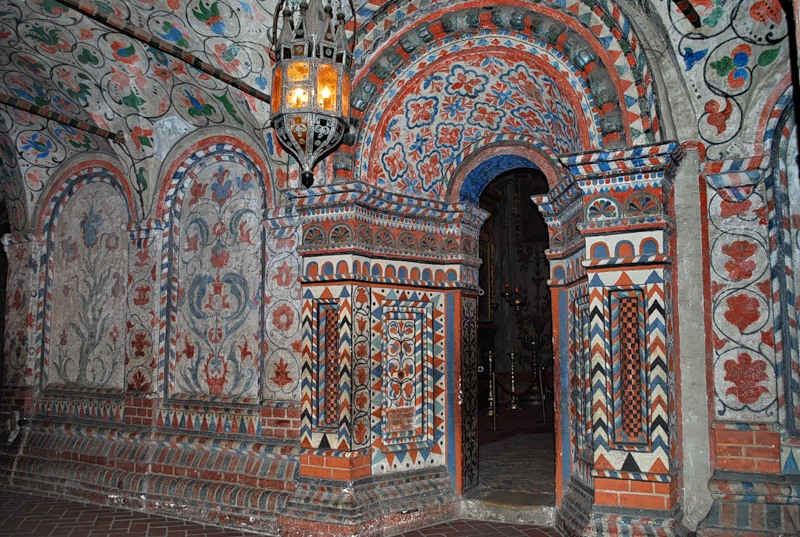 Фундамент храма монолитный и не располагает подвальными помещениями. Стены основания достигают толщины 3 метров и перекрываются сводами. В высоту помещения достигают 6,5 метров. Особая, уникальная в своем роде конструкция, оснащенная узкими отверстиями и выполненная из так называемого дышащего кирпича, позволяет сохранить особый микроклимат практически в любое время года. Тем не менее, все церкви были холодными, богослужения там совершались только в летний период и по большим праздникам зимой. Путешествуя по храму, ясно чувствуется архитектурный ритм, потрясающая смена объемов, которая создается разными размерами церквей, проходов и объединяющих их площадок. Внутренние помещения очень разнообразны. Такое разнообразие ширины и высоты помещений, вкупе создает общую картину лабиринта.
