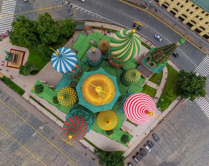 Купола собора Василия Блаженного на всех восьми церквях представляют собой так называемые луковичную форму, каждая из которых отлична от другой. Такими куполами увенчаны восемь церквей, сгруппированных вокруг центральной девятой церкви, купол которой представляет собой шатер с небольшой главкой. Именно с расцветкой, рисунком и характером отделки куполов и ассоциируется у большинства туристов этот архитектурный ансамбль в центре столицы. А купола собора Василия Блаженного в свою очередь и являются тем магнитом, который через фотографии, открытки, марки, игрушки и иную сувенирную продукцию притягивает к себе интерес мировой общественности.
