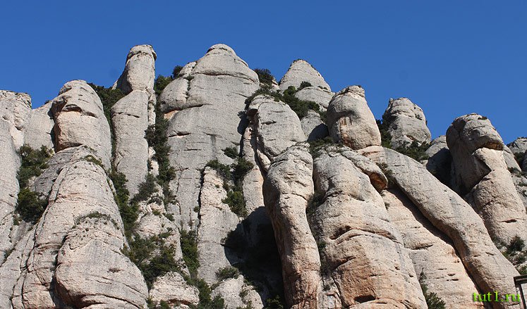 Путешествие на Монсеррат начинается у подножия скалы. В гору ползет монорельсовый вагончик со звучным названием кремальера. По мере подъема становится понятно почему эти скалы носят название Монсеррат, то есть "распиленная гора", и почему на гербе аббатства ангелы усердно распиливают гору двуручной пилой. Эти причудливые скалы и названия имеют соответствующие — тут есть и Мумия, и Кукла, и Фараон, и малопочтенное Брюхо епископа, и Лошадь Бернарда. А есть и мистические названия — Заколдованные монахи, Свисток ведьмы, Две Магдалины.