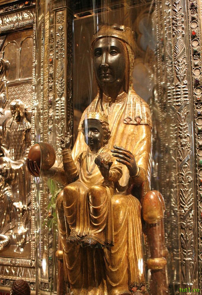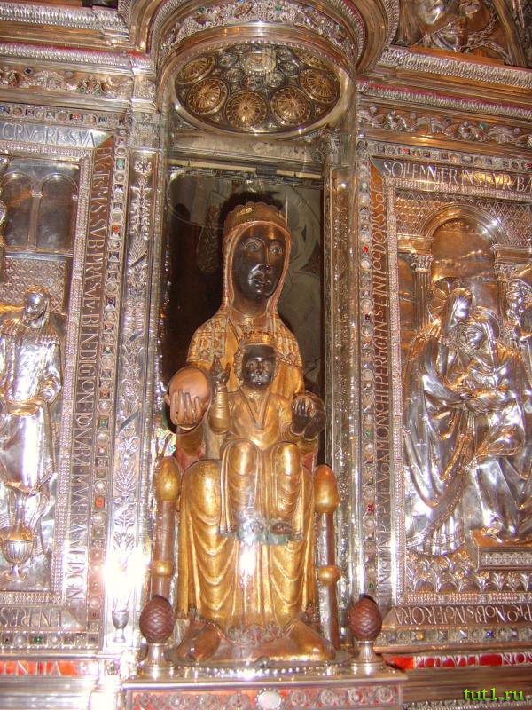 К алтарю, который находится в тронном зале всегда тянется очередь, чтобы поклонится святой покровительнице Каталонии. Каждый хочет коснуться её рукой и заручится её благословением. Своё название метровая статуя получила потому, что вырезанна она из черного тополя, что и придает ей такой темный цвет. А каталонцы ласково называют её La Moreneta — по каталонски "смугляночка". Кажется, что взгляд маленькой женщины, укрытой за бронированным стеклом, обращен в никуда. Наверное, так смотрят в вечность и потому этот взгляд зачаровывает. Каталонский поэт написал строки, пусть и напыщенные, но, по сути, отражающие отношение каталонцев к своей Черной Мадонне — "Ангельская роза, Черная Дева распиленных гор, ты освещаешь землю Каталонии, ты венчаешь собой небо".