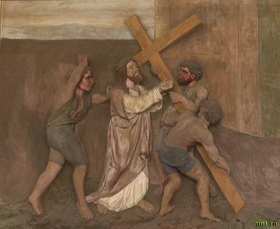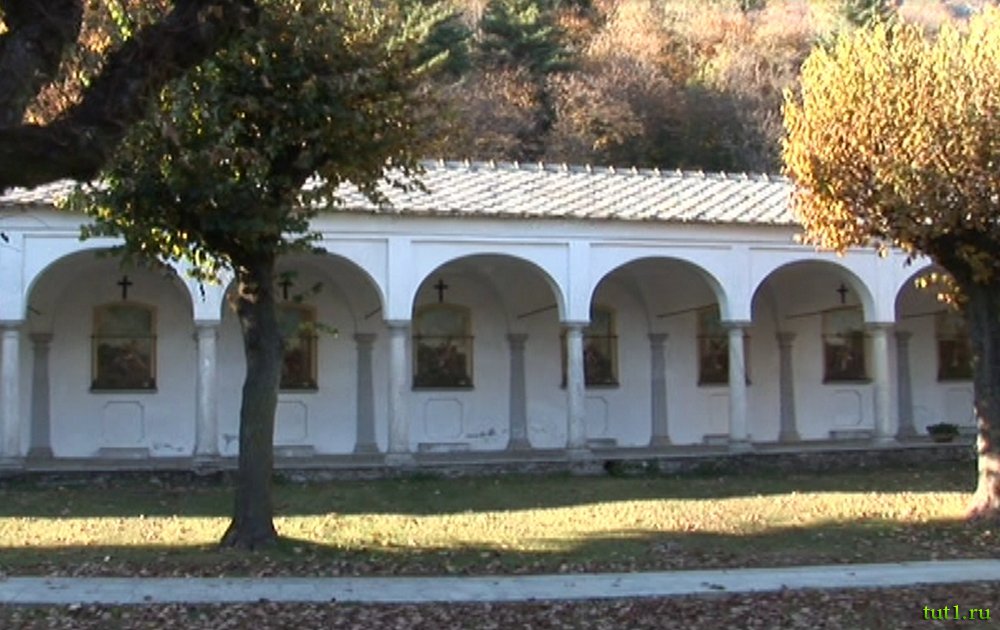 Площадь "священной горы" окружена крытой галереей. В галерее изображены Стоянки на Крестном пути Христа. Изначальная колоннада с фресками была построена в 1752-м году, а в 1824-м году на ней были изображены сцены распятия. Она состояла из четырнадцати сводов с арками. Капелла Дела де Ларатта, позднего периода барокко, была достроена в северной части аркады позднее.