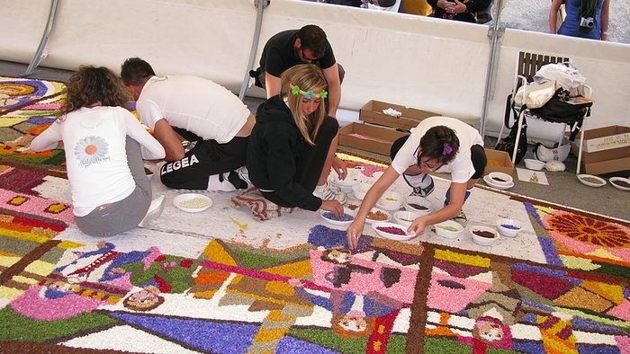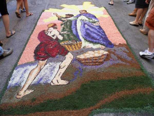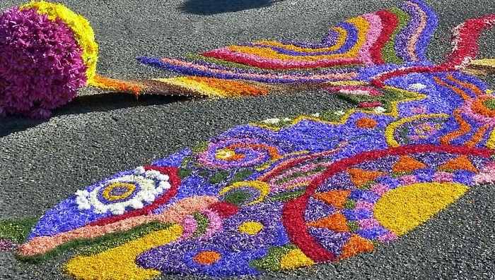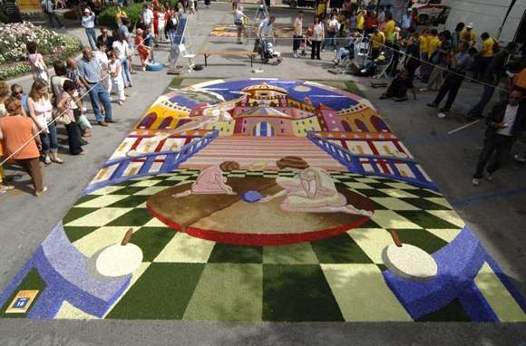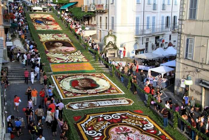 Город Спелло славится своими цветочными коврами, которые выкладывают на праздник Тела Христова. А всё началось совершенно случайно. В 1930-м году, одна горожанка, находясь в состоянии влюбленности, выложила возле своего дома картину из цветочных лепестков.