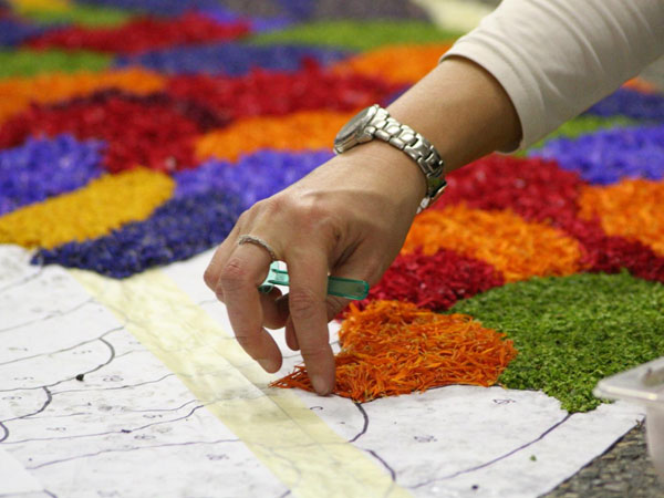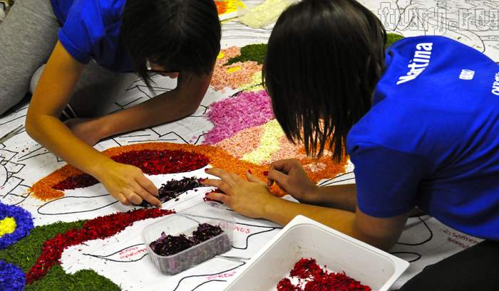 Как создается это чудо? Вначале картины рисуются на огромных листах бумаги, затем, с помощью обычного клейстера, эти листы приклеиваются к асфальту. Сооружается тент, чтобы защитить искусство от дождя и ветра. После чего авторы картины берут коробочки с цветами, листьями и лепестками нужного цвета и ими, как мозаикой, выкладывают полотно.