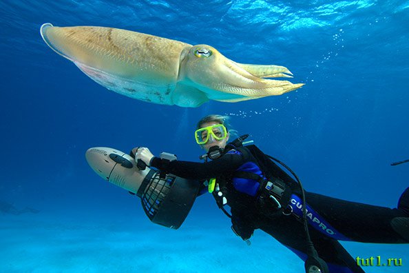 Огромная каракатица, похожая на осьминога, — мастер маскировки. Её кожа покрыта специальными клетками, отражающими свет в разных направлениях, что позволяет ей сливаться с местностью когда она сидит в засаде. Она, так же имеет странную сине-зеленую кровь — настоящий пришелец в подводном мире Мальдив.