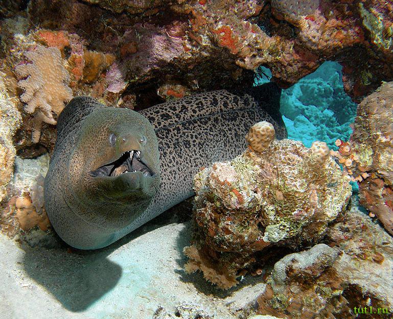 Обычно малоподвижные мурены представляют гораздо большую опасность для ныряльщиков чем акулы. Мурен привлекают блестящие вещи, и они известны тем, что выскакивают из своих норок, чтобы сорвать с пловца кольцо или браслет. Их большие выпуклые глаза здесь бесполезны, и они больше полагаются при охоте на своё хорошо развитое обоняние. Взрослые особи достигают около 1,5 метров в длину. Они выплывают из своих пещер лишь для того, чтобы поохотится на мелких рыбок, моллюсков и ракообразных. Поэтому ныряльщикам не часто удается увидеть их на открытом пространстве. А кому удается — это редкий шанс понаблюдать за их оригинальным стилем плаванья.