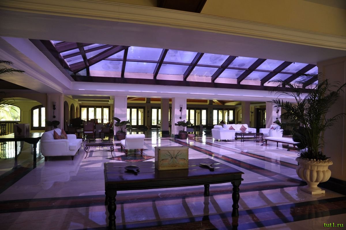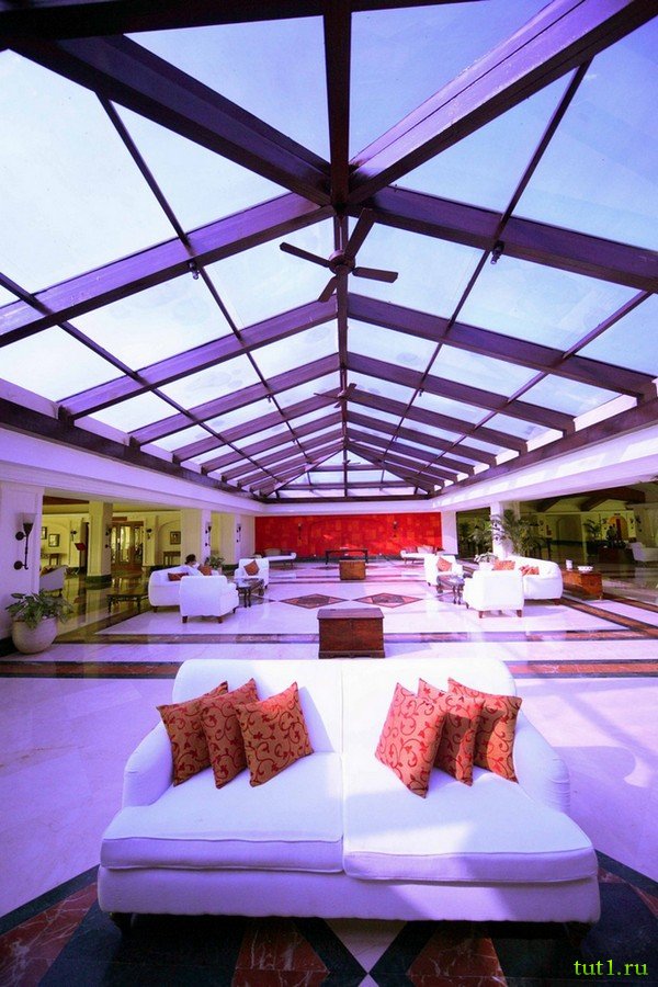 Холл отеля Taj Exotica занимает около 2-х тысяч квадратных метров. На сегодня, это самый большой холл в Индии. Огромный холл сделан в стиле португальского особняка. На территории отеля есть две небольшие площадки для гольфа на 9 лунок, чтобы посетители отеля проводили больше времени на зеленых лужайках и наслаждались прекрасными садами с ухоженными экзотическими растениями. Кроме того, есть спа в традициях аюрведы (нетрадиционной медицины), и не забывайте про йогу, ведь именно Индия подарила её миру.