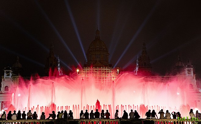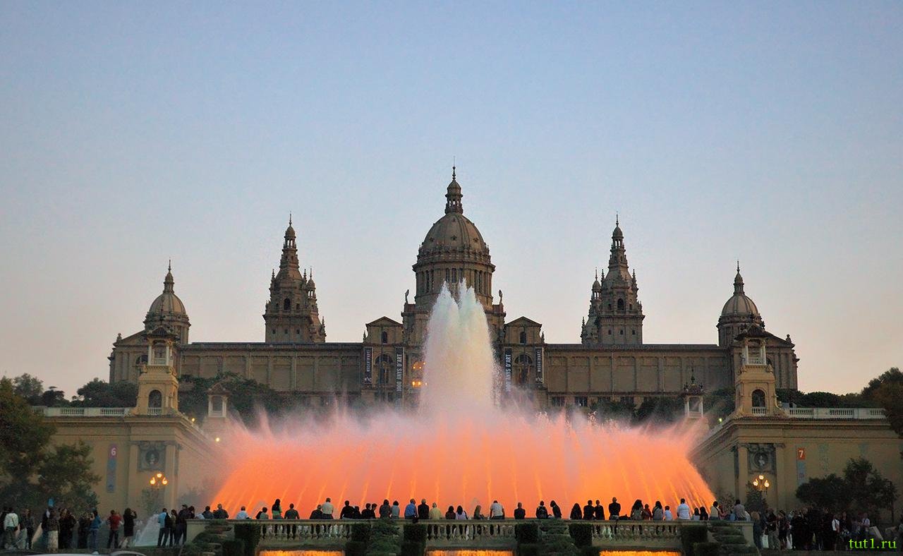 Фонтан, который украшает Национальный дворец и парк Монжуик, имеет огромные размеры — его площадь составляет около 3 тысяч квадратных метров, а высота струй достигает 50 метров. Данный фонтан состоит из большого количества маленьких фонтанчиков. Оригинальное название фонтана — фонтан Монжуик, однако, оно почему то не прижилось. Испанцы данную достопримечательность Барселоны называют «Фонтанас Магикас», что в переводе означает «магические фонтаны» — сочетание света, воды и музыки создают здесь некую ауру волшебства. Русскоговорящие туристы зовут их просто — «поющие фонтаны». Вода в этом фонтане включается через каждые 20 минут, а вот музыка и свет только в вечернее время. Шоу у фонтана длится всего пять раз в день по 30 минут. В летнее время фонтан начинает свое «выступление» в 21:00 и заканчивает в 23:00, программа повторяется через каждые полчаса. В зимний период шоу начинается в 19:00 и заканчивается в 20:30. Первая половина программы сопровождается классической музыкой, вторая — мировыми хитами поп-музыки.