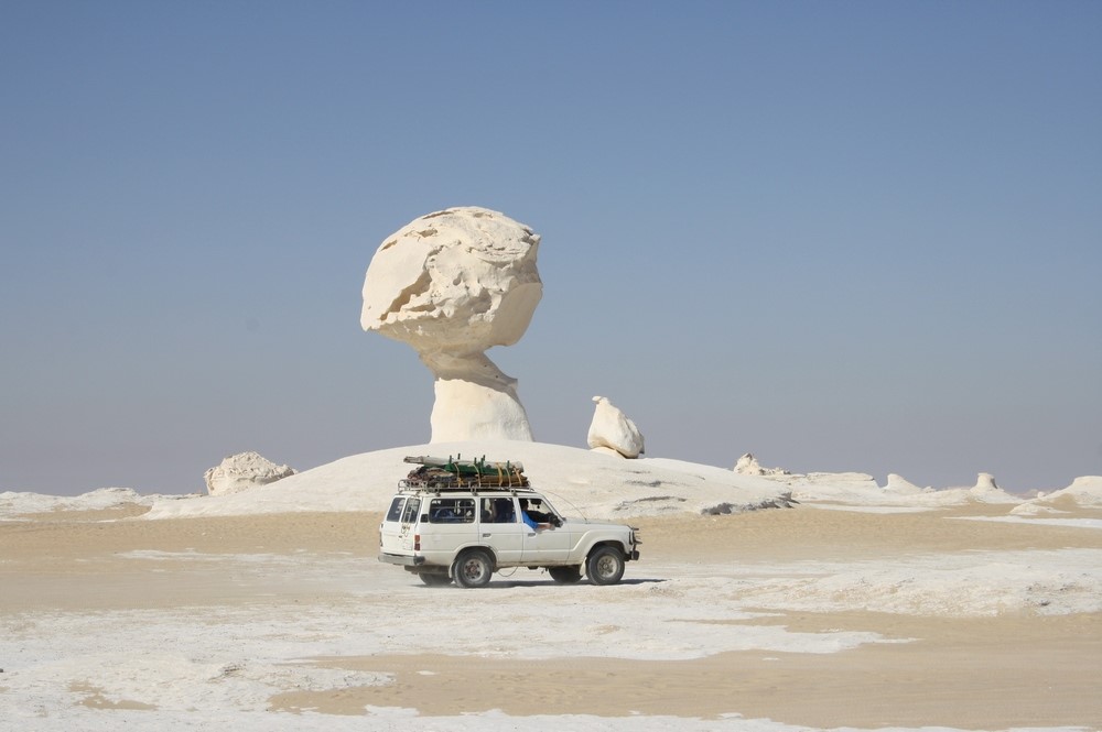 Миллионы лет назад на месте песков было море. Постепенно вода ушла, на её месте остались каменные глыбы из карста, известняка и отвердевшего мела. Ветра и песок обрабатывали её тысячелетиями, и теперь любопытный турист может наблюдать причудливые каменные фигуры, которые практически не вписываются в изображение реальности. Похоже, что пирамиды — это не единственное чудо в такой, непонятной нашему туристу, арабской стране. Тут будто не работают законы физики: на тонкой ножке прилегла глыба весом в десятки тонн, встречаются поляны громадных меловых грибов. Не диво ли? Голубое небо и белоснежная почва создают картину неземного великолепия. Ты уже не понимаешь, где облака, а где песок, где реальность, а где фантазия, будто оказываясь в волшебном месте. Только здесь, будучи наедине с природой, человек ощущает её силу и мощь, чувствует себя крупицей этого неизведанного мира.
