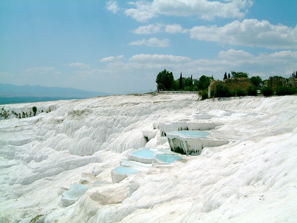 Название прекрасного турецкого курорта Памуккале на местном наречии означает «хлопковый замок». Древняя история рассказывает о мифических титанах, которые собрали огромный урожай хлопка и разбросали его для просушки на скалах. Поэтому они и стали белоснежными. Туристы съезжаются в Памуккале ради фантастического пейзажа и термальных источников, которые на протяжении многих веков остаются непревзойденным природным феноменом. Комплекс источников занял вулканическое плато, из-под основания которого с шипением рвутся вверх целебные потоки, обогащенные кальцием. Стекая целыми ручьями по горным склонам, горячая вода за тысячелетия создала естественный и в тоже время необычайный пейзаж. Выбрасываемый в воздух кальций застывал, формируя привлекательные каскады, бассейны и террасы. Они сравнимы с перевернутыми чашами. Неудивительно, что причудливое образование оставляет неизгладимые впечатления. Глядя на бесконечное ослепительное море из белых скал со стекающими парящими водопадами и ручейками, невольно ощущаешь нереальность окружающего мира. На подобное чувство наталкивает и необычный, просто целебный запах воздуха. И если верить еще одному старинному мифу, именно в Памуккале в Турции скрыт вход в царство Аида.